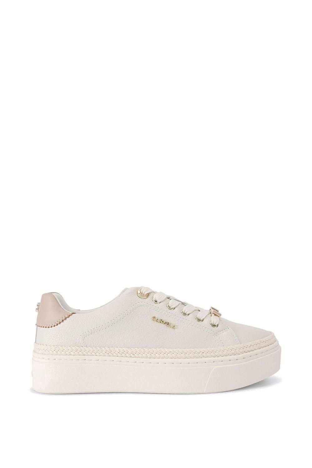 The Carvela Caprese Trainer is crafted in a white leather. The front laces up with a gold branded tab. The sole is pumped up with a braided rope detail around it.
